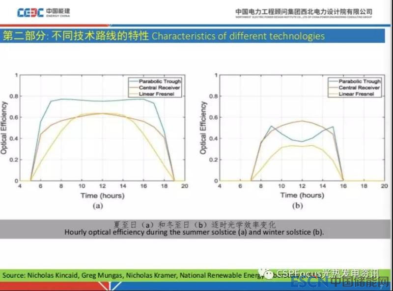 首先,上一組圖橫坐標是某一天時刻數(shù),縱坐標是不同技術路線光學效率,左邊的圖是夏至日曲線,右邊的圖是冬至日曲線,藍色是槽式,中間橙色是塔式,黃色是菲涅爾。這組曲線地理位置在北緯36度,跟西安差不多的地方,夏季槽式電站光到熱是很關鍵的步驟,由圖可見,槽式具有比較明顯的更為優(yōu)越的光學效率,相應的塔式電站低一些,菲涅爾一天當中隨著時間推移效率變化是比較明顯的,就是表現(xiàn)為曲線的峰在時間維度比較窄,不像槽式和塔式很快可以達到較高效率,且能維持在較高效率環(huán)節(jié)較長時間。