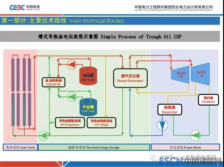 最為成熟的槽式導熱油帶儲熱電站,集熱場加熱后的導熱油溫度不是很高。大概290度導熱油進集熱場之后經(jīng)過集熱器加熱到大概390度,首先優(yōu)先進入到蒸汽發(fā)生器和水換熱產(chǎn)生蒸汽,驅動汽輪機發(fā)電。當集熱場產(chǎn)生的熱功率大于汽輪機所需要的功率時候,多余的能量進儲換熱單元的油鹽換熱器,存儲在熔鹽中。熔鹽儲熱的時候冷的熔鹽通過低溫熔鹽泵循環(huán)吸熱,存儲在熱鹽罐里面,當夜間的時候熱熔鹽通過高溫熔鹽泵,在同樣一個換熱器里面將熱量傳給導熱油,導熱油再把熱量傳輸給蒸汽發(fā)生器里面的水,以產(chǎn)生蒸汽來發(fā)電。