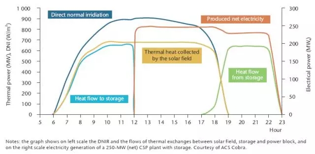 研究指出,太陽(yáng)能熱發(fā)電站的熱慣性和一定時(shí)間的儲(chǔ)熱容量足夠提供這些服務(wù)。儲(chǔ)熱的概念很簡(jiǎn)單:白天,多余的熱量被轉(zhuǎn)移到一種儲(chǔ)熱材料中(例如,熔融鹽)。當(dāng)日落后有生產(chǎn)需求時(shí),儲(chǔ)存的熱量被釋放到蒸汽循環(huán)中,電站持續(xù)發(fā)電。圖1示例了12:00-23:00期間太陽(yáng)能熱發(fā)電站的日資源變化(DNI)和從太陽(yáng)場(chǎng)到透平機(jī)和儲(chǔ)熱,以及從太陽(yáng)場(chǎng)和儲(chǔ)熱到透平機(jī)的流向。儲(chǔ)熱可以將發(fā)電和太陽(yáng)能收集分開(kāi)。