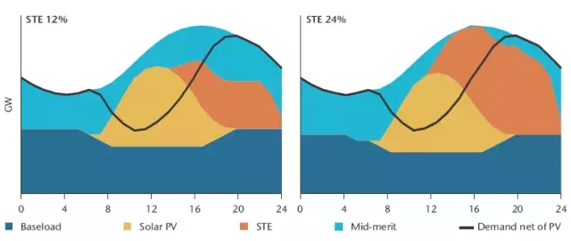 在下午和傍晚為用電高峰的國(guó)家,最大比重可能面向光伏。然而在部署光伏以后,當(dāng)晚上高峰增加時(shí)光伏的負(fù)荷曲線變得更有利于太陽(yáng)能熱發(fā)電。太陽(yáng)能熱發(fā)電能夠很好地對(duì)這些變化作出響應(yīng)(圖2)。關(guān)鍵點(diǎn)在于太陽(yáng)能熱發(fā)電站根據(jù)高峰和中峰需求發(fā)電;日落后,其容量補(bǔ)充當(dāng)天早些時(shí)候的光伏發(fā)電量。