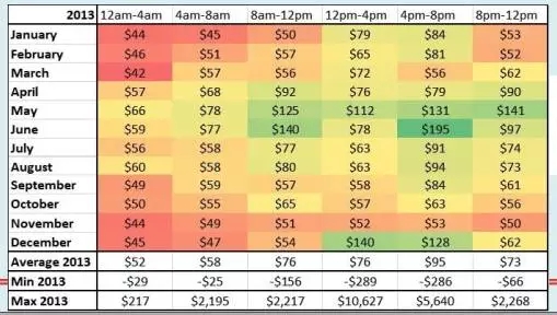 圖3:2013年南澳在不同月份中不同時(shí)間段的電力價(jià)格情況