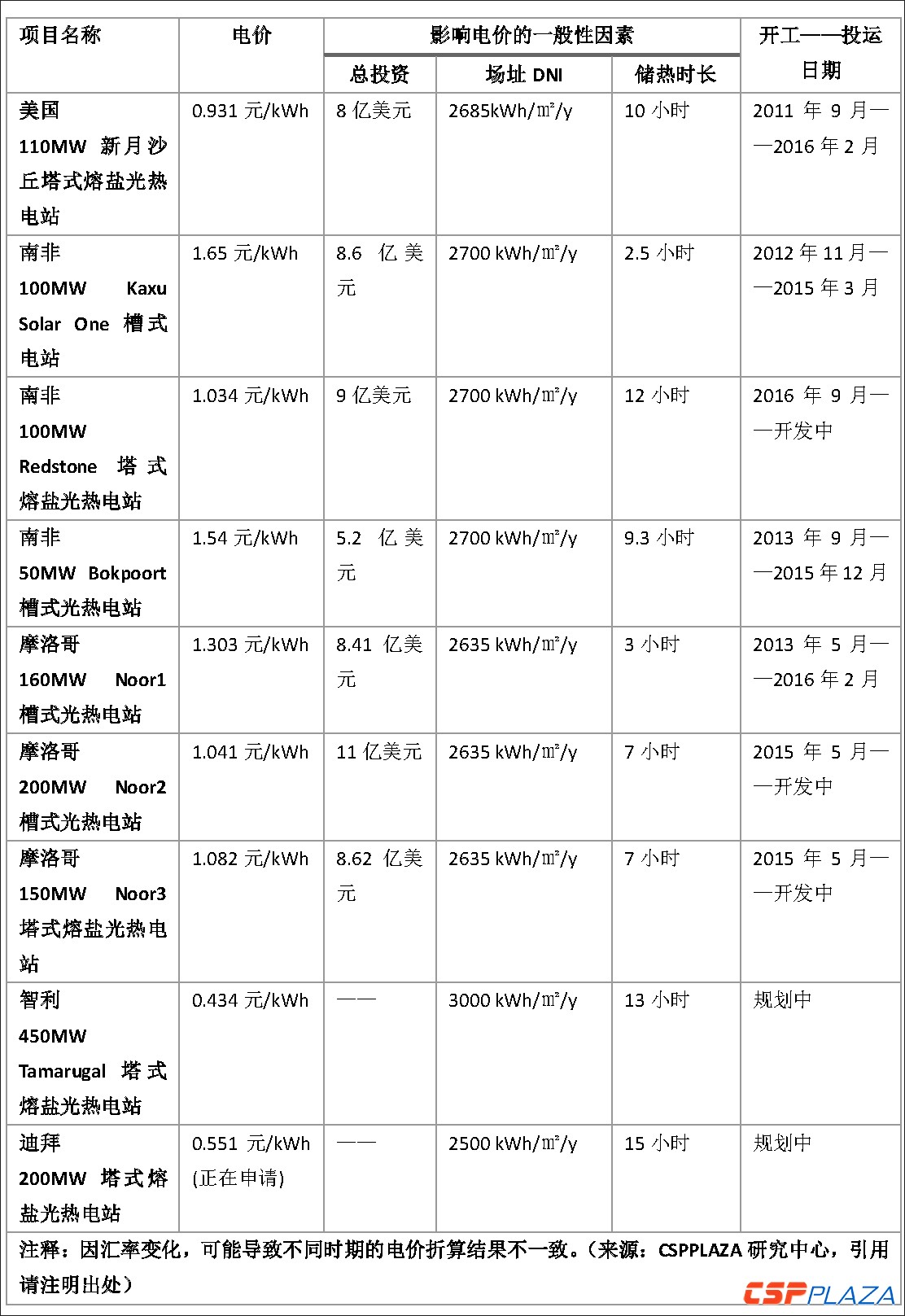 總體來看,如果不考慮優(yōu)惠政策支持等特殊影響因素,除去2017年剛剛開始規(guī)劃的智利和迪拜項(xiàng)目,在南非和摩洛哥這類輻照資源很好的地區(qū)開發(fā)光熱電站,其最低電價水平約1.03元/kWh(按當(dāng)前匯率折算)。