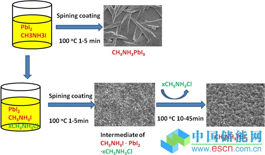 鈣鈦礦太陽(yáng)能電池研究的一個(gè)難點(diǎn)是如何獲得連續(xù)、致密的高質(zhì)量的鉛鹵鈣鈦礦薄膜層。上海交大可再生能源研究團(tuán)隊(duì)創(chuàng)造性的將CH3NH3Cl作為形貌控制劑,成功制備出光滑致密的鈣鈦礦層,解決了這項(xiàng)關(guān)鍵技術(shù)難題。該添加劑可同時(shí)改變旋涂鈣鈦礦的晶體生長(zhǎng)并且調(diào)整所產(chǎn)鈣鈦礦膜的形貌,這種新方法解決了常規(guī)的一步法鈣鈦礦薄膜結(jié)晶過(guò)程對(duì)溫度、濕度要求苛刻且耗時(shí)長(zhǎng)的缺點(diǎn),同時(shí)解決了兩步法前驅(qū)體中碘化鉛殘留等物質(zhì)對(duì)電池效率的不良影響。通過(guò)光滑致密的鈣鈦礦層制備的高質(zhì)量的混合型鉛鹵鈣鈦礦CH3NH3PbI2Br的光電轉(zhuǎn)化效率達(dá)到國(guó)際領(lǐng)先水平,相關(guān)成果發(fā)表在國(guó)際權(quán)威期刊J. Am. Chem. Soc. (DOI:10.1021/ja5071398)和J. Mater. Chem. A (DOI:10.1039/C4TA05384B)上。
