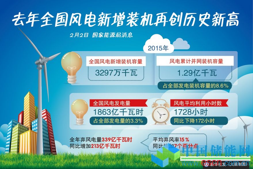 國家能源局2日消息,2015年,全國風(fēng)電新增裝機(jī)容量3297萬千瓦,再創(chuàng)歷史新高;風(fēng)電累計(jì)并網(wǎng)裝機(jī)容量達(dá)到1.29億千瓦,占全部發(fā)電裝機(jī)容量的8.6%。