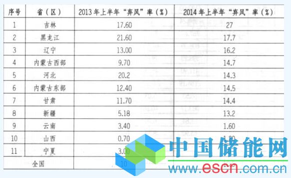 從表1可以看出,全國風(fēng)電棄風(fēng)率仍然較高?!叭薄钡貐^(qū)“‘棄風(fēng)”現(xiàn)象與去年同期相近,仍然比較突出。西北地區(qū)棄風(fēng)率上升較大。新疆近兩年風(fēng)電并網(wǎng)加快,但外送高壓輸電線路建設(shè)滯后,導(dǎo)致棄風(fēng)率上升。黑龍江省與河北省2014年上半年由于送出通道建設(shè)較好,使得“棄風(fēng)”率有所下降;云南、寧夏“棄風(fēng)”現(xiàn)象比去年同期明顯好轉(zhuǎn),“棄風(fēng)”率已經(jīng)低于2%。