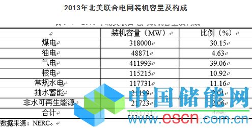 2013年,北美聯(lián)合電網(wǎng)總裝機容量(指高峰凈裝機,扣除了廠用電,小于銘牌裝機)為10.55億kW,其中,氣電占39.06%,煤電占30.15%,常規(guī)水電占11.16%,核電占10.92%。