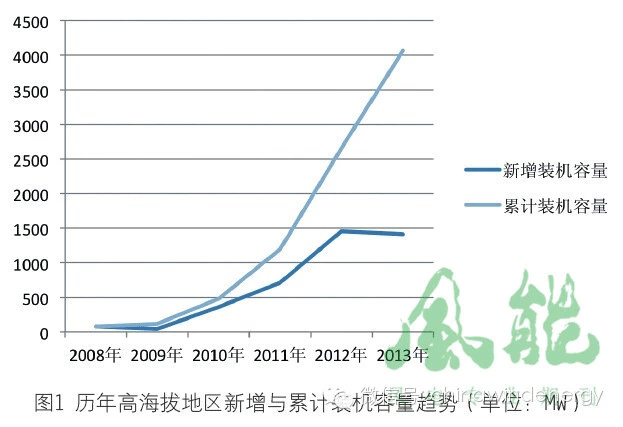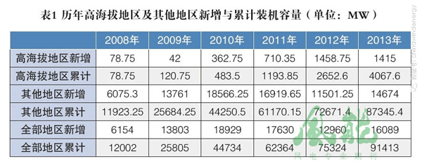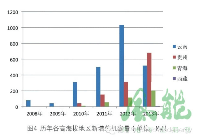 據(jù)中國可再生能源學會風能專業(yè)委員會的數(shù)據(jù)顯示,中國從2008年開始在高海拔地區(qū)有風電裝機,到2013年底累計裝機容量達到4067.6MW。在此6年間,高海拔地區(qū)新增裝機量總體呈現(xiàn)以上升為主,期間略有波動的趨勢。其中,除2009年和2013年與前一年的新增裝機量相比略有下降外,2008年、2010年、2011年和2012年高海拔地區(qū)的新增裝機容量都比前一年有所上升。2013年,中國高海拔地區(qū)新增裝機容量為1415MW,占全部新增裝機容量的8.79%,相比2012年的1458.75MW及11.26%的占比,各數(shù)據(jù)均有所下降。與2012年相比,新增裝機容量在2013年下降的比較小,而占比卻下降的比較大,這從側(cè)面印證了2012年高海拔以外地區(qū)的新增裝機量曾出現(xiàn)較大的下降。雖然2012年以前新增裝機容量上升速度較快,但由于此前的裝機基數(shù)并不大,表現(xiàn)在累計裝機增長上并不明顯,與之相反的是,2011年以后高海拔地區(qū)的新增裝機量達到了一定的量級,雖然在2013年有所下降,但累計裝機上升的卻更為明顯。
