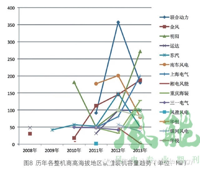 在高海拔地區(qū)的新增裝機容量方面,2013年明陽的該項數(shù)據(jù)最為惹眼,為272MW。第二位的上海電氣為200MW。第三位的金風為187.5MW,第四位的聯(lián)合動力為180MW,第五位的重慶海裝為128MW。其中聯(lián)合動力是2012年在高海拔地區(qū)新增裝機最高的整機商,達到了357MW,這也是截至2013年底單個整機商在高海拔地區(qū)一年時間內(nèi)的最大裝機量。由圖8可以看出,各整機商在高海拔地區(qū)歷年的新增裝機量變化較大,使名次變化也較為頻繁,說明在高海拔地區(qū)的風電裝機本身量不是太大,從而受項目影響比較大。