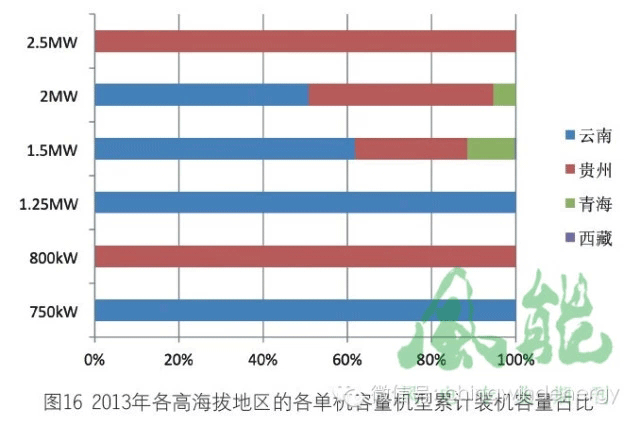 2013年各單機容量的風電機組中,在高海拔地區(qū)累計裝機容量占比最高的是1.5MW型機組,達76.92%。其次是2MW機組,為14.8%。2.5MW和750kW機組分別占比在2.34%和2.3%左右。占比最小的是800kW型機組,是由風盈風電在2012年貴州安裝的2臺。