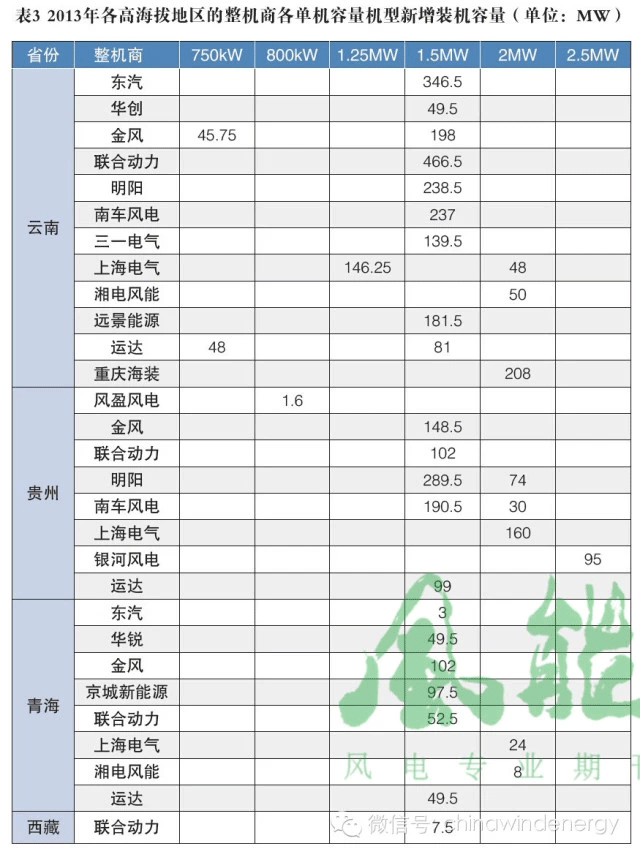 2008年金風和運達在云南分別安裝了各自生產(chǎn)的750kW型風電機組,至2013年,在高海拔地區(qū)累計安裝風電機組最多的整機商是聯(lián)合動力,其次是明陽,以及金風、南車、上海電氣。這些整機商在高海拔地區(qū)的風電機組累計裝機容量分別為628.5MW、602MW、494.25MW、457.5MW和378.25MW。