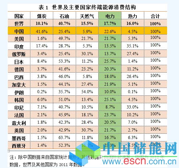 中國儲能網(wǎng)訊:電能占終端能源消費的比重代表電力替代煤炭、石油、天然氣等其它能源的程度,是衡量一個國家終端能源消費結(jié)構(gòu)和電氣化程度的重要指標。電能是清潔、高效、便利的終端能源載體,在大力推進低碳發(fā)展,大規(guī)模開發(fā)可再生能源,積極應(yīng)對氣候變化的全球發(fā)展趨勢下,提高電能占終端能源消費比例已成為世界各國的普遍選擇。世界及主要國家終端能源消費結(jié)構(gòu)如表1所示。