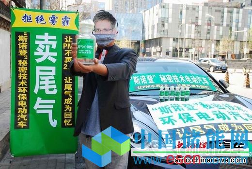 在叫賣尾氣的現(xiàn)場,記者見到一輛被改裝為電動車的、疑似保時捷的車輛,車身披掛著“斯諾登秘密技術(shù)環(huán)保電動汽車讓PM不再2.5、讓尾氣成為回憶”、“拒絕霧霾”等字樣,一位提供電動汽車全面技術(shù)的機(jī)構(gòu)工作人員,戴著面具以及防霾口罩,在電動車旁舉著一個1000毫升容積的玻璃罐子叫賣。據(jù)該人士稱,罐子里密封的是剛從燃油車排氣管口收集到的“新鮮”尾氣。據(jù)稱這樣一瓶“收藏專用”尾氣象征性地僅售5元錢。