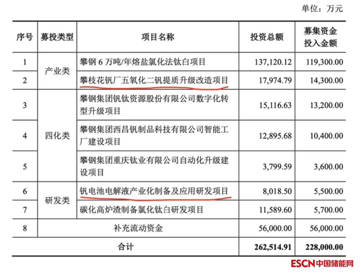 且正在進(jìn)行的非公開發(fā)行股票方案中,公司擬使用募投資金建設(shè)兩個釩儲能相關(guān)項(xiàng)目,包括投資1.80億元的攀枝花釩廠五氧化二釩提質(zhì)升級改造項(xiàng)目,以及投資8018.5萬元的釩電池電解液產(chǎn)業(yè)化制備及應(yīng)用研發(fā)項(xiàng)目。