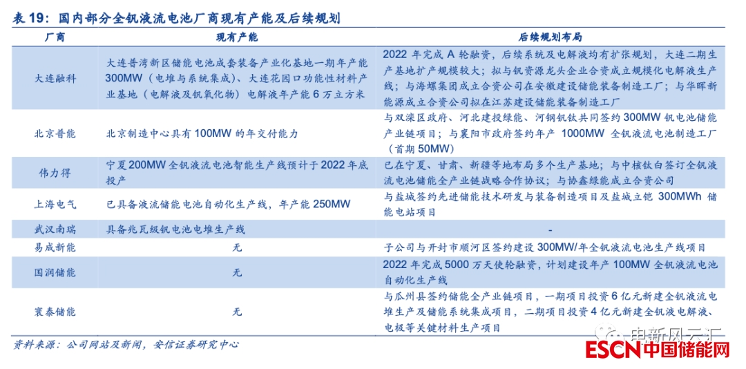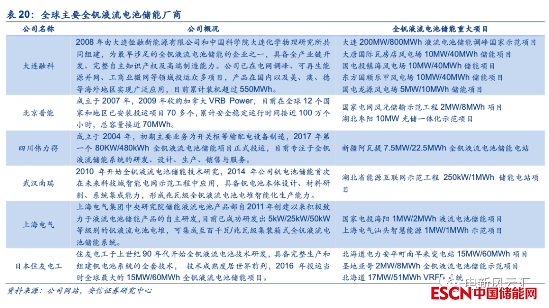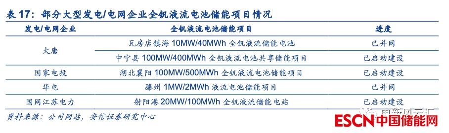 短期內(nèi)全釩液流電池的主要應(yīng)用場景為大規(guī)模電網(wǎng)側(cè)/發(fā)電側(cè)項目,投資主體為大型發(fā)電/電網(wǎng)企業(yè)??紤]到當(dāng)前國內(nèi)儲能最重要的驅(qū)動因素為新能源發(fā)電側(cè)的強制配套要求,且全釩液流電池自身的初始投資成本相對較高,我們預(yù)計短期內(nèi)全釩液流電池儲能項目的投資將主要由大型發(fā)電企業(yè)或電網(wǎng)企業(yè)主導(dǎo)。目前大唐、國家電投、中廣核等大型電力集團已經(jīng)啟動了百MWh級別的全釩液流電池儲能項目建設(shè),華電、國網(wǎng)江蘇等亦在進(jìn)行示范性項目的嘗試,經(jīng)過前期項目的驗證,未來全釩液流電池有望成為大型電力集團重點布局的一類儲能形式。