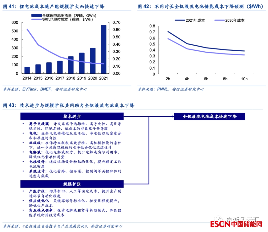 產(chǎn)業(yè)化進(jìn)程加速有望助力全釩液流電池成本持續(xù)下降?;仡欙L(fēng)電、光伏、鋰電等新能源產(chǎn)業(yè)的發(fā)展歷程,產(chǎn)能擴大帶來的規(guī)模效應(yīng)是成本下降的重要驅(qū)動因素。此前較低的產(chǎn)業(yè)化程度嚴(yán)重制約了全釩液流電池成本下降的速度,未來隨著產(chǎn)能的快速擴張,無論是供應(yīng)鏈還是生產(chǎn)制造環(huán)節(jié)均有望實現(xiàn)成本的快速攤薄,行業(yè)或?qū)⑦M(jìn)入“產(chǎn)能擴大-成本下降-需求提升-進(jìn)一步助推產(chǎn)業(yè)發(fā)展”的良性循環(huán)。根據(jù)美國太平洋西北國家實驗室(PNNL)的預(yù)測,2030年全釩液流電池的初始投資成本(100MW/4h系統(tǒng))將由2021年的500美元/kWh以上降低至420美元/kWh左右,考慮到當(dāng)前的技術(shù)進(jìn)步與規(guī)模擴張速度,我們認(rèn)為實際的降本速度有望更快。
