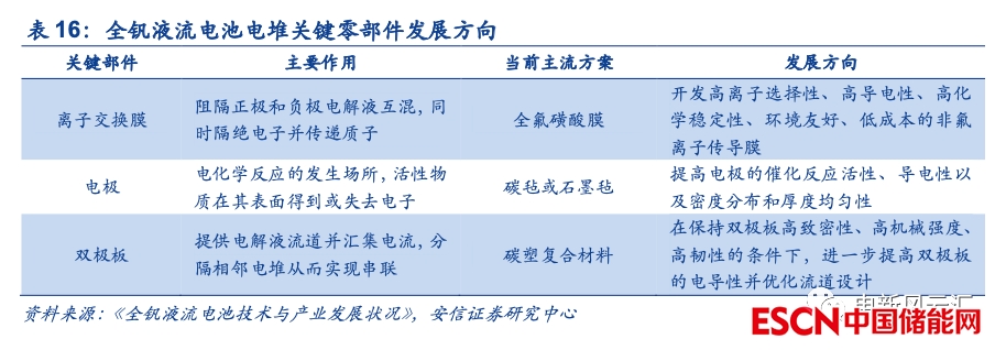 現(xiàn)階段全釩液流電池電堆關(guān)鍵部件以廠商自產(chǎn)或定制為主,后續(xù)技術(shù)進(jìn)步以及規(guī)?;慨a(chǎn)將帶動成本持續(xù)下行。相較于資源成本主導(dǎo)的能量單元(釩占據(jù)成本大頭),我們認(rèn)為功率單元未來存在較大的降本空間。一方面,關(guān)鍵部件以及系統(tǒng)設(shè)計層面的技術(shù)進(jìn)步將帶動全釩液流電池電堆持續(xù)降本增效,例如開發(fā)高離子選擇性、高導(dǎo)電性、高化學(xué)穩(wěn)定性、低成本的離子交換膜,提升雙極板電導(dǎo)性,提高電極反應(yīng)活性以及導(dǎo)電性等。另一方面,現(xiàn)階段全釩液流電池產(chǎn)業(yè)整體規(guī)模有限,關(guān)鍵部件以全釩液流電池廠商自產(chǎn)或小批量定制為主,后續(xù)隨著生產(chǎn)規(guī)模的提升,整體的制造成本有望明顯攤薄。此外,從原理和構(gòu)成的角度出發(fā),全釩液流電池與氫燃料電池在關(guān)鍵材料(雙極板、離子膜、電極等)、電堆結(jié)構(gòu)以及生產(chǎn)設(shè)備等方面都存在較大的相似性,后續(xù)氫能產(chǎn)業(yè)的蓬勃發(fā)展也有望推動相關(guān)產(chǎn)業(yè)鏈環(huán)節(jié)的快速成熟。