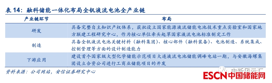 現(xiàn)階段全釩液流電池廠商一體化程度較高,產(chǎn)業(yè)鏈生態(tài)初步建立。整體來看當(dāng)前全釩液流電池儲能仍處于商業(yè)化運營初期,市場參與者相對較少,行業(yè)前期的發(fā)展很大程度上由頭部廠商進(jìn)行推動。國內(nèi)對全釩液流電池的研究始于20世紀(jì)90年代初,早期主要由中國工程物理研究院、大連化學(xué)物理研究所、中南大學(xué)、清華大學(xué)等科研院所進(jìn)行相應(yīng)實驗室研發(fā),其中大連化物所在國家科技部“863”計劃項目的支持下于2005年成功研制出當(dāng)時國內(nèi)規(guī)模最大的10kW全釩液流電池儲能系統(tǒng),邁出了國內(nèi)全釩液流電池儲能技術(shù)應(yīng)用的第一步。行業(yè)龍頭融科儲能于2008年成立,經(jīng)過數(shù)十年發(fā)展,公司具備從前端研發(fā)到后端項目運營的全產(chǎn)業(yè)鏈開發(fā)能力,深度參與全釩液流電池產(chǎn)業(yè)鏈各個環(huán)節(jié)。由于前期全釩液流電池技術(shù)尚未定型,且項目體量相對較小,行業(yè)呈現(xiàn)出非標(biāo)化、定制化的特點,產(chǎn)業(yè)鏈生態(tài)主要由一體化的頭部廠商主導(dǎo)。