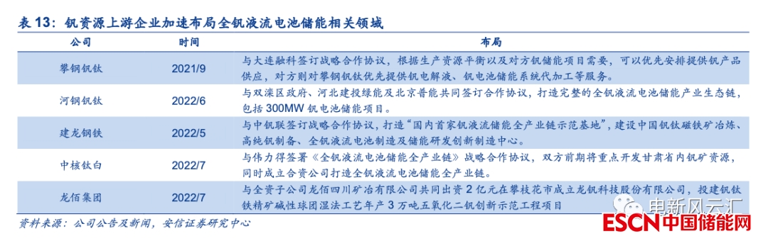 龍頭釩資源企業(yè)積極布局全釩液流電池市場。在傳統(tǒng)鋼鐵領(lǐng)域需求趨于穩(wěn)定的背景下,新興的全釩液流電池儲能市場正成為釩資源企業(yè)未來重要的潛在增長點,龍頭廠商已在相關(guān)領(lǐng)域進(jìn)行了大量布局。例如攀鋼釩鈦于2021年9月公告與大連融科簽訂《戰(zhàn)略合作協(xié)議》,將根據(jù)生產(chǎn)資源平衡以及釩儲能項目需要優(yōu)先為其安排釩產(chǎn)品供應(yīng),2022年雙方已就全釩液流電池用釩儲能介質(zhì)委托加工和釩儲能介質(zhì)購銷簽訂了商業(yè)合同,預(yù)計交易金額約5億元。2022年以來河鋼、建龍、中核鈦白等上游資源廠商亦相繼與北京普能、偉力得等全釩液流電池廠商簽訂戰(zhàn)略合作協(xié)議。