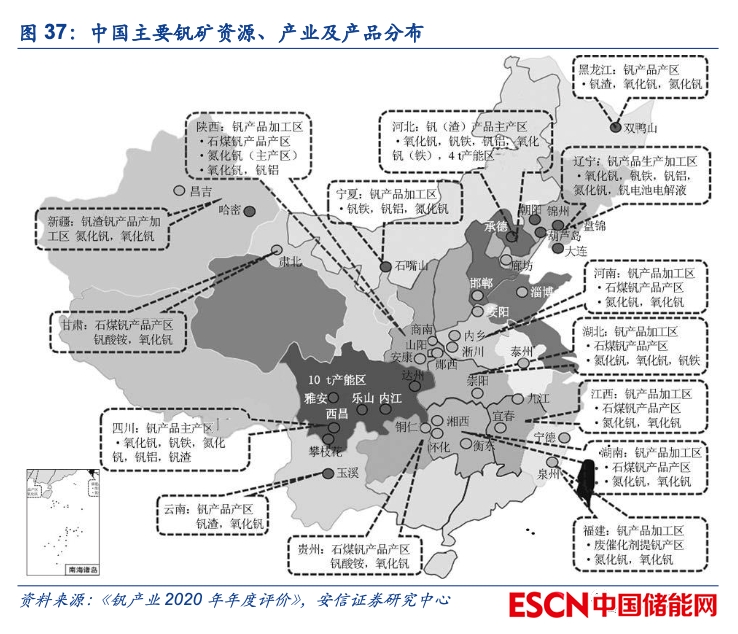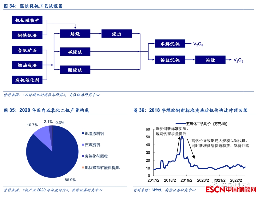 目前釩鈦磁鐵礦是主要的釩供給來源,未來石煤有望貢獻(xiàn)一定增量。我國釩資源主要以釩鈦磁鐵礦和含釩石煤兩種形式存在,其中石煤礦中釩的品味較低且提釩過程中污染較為嚴(yán)重,整體生產(chǎn)成本高于鋼渣提釩,目前國內(nèi)絕大多數(shù)釩產(chǎn)品來源于釩鈦磁鐵礦經(jīng)鋼鐵冶煉得到的富釩鋼渣(2020年占比超過85%)??紤]到鋼渣提釩的產(chǎn)出一定程度上取決于釩鋼產(chǎn)量,整體供給相對穩(wěn)定,我們認(rèn)為隨著全釩液流電池市場需求的增加以及技術(shù)的進(jìn)步,未來石煤提釩或?qū)⒇暙I(xiàn)一定的增量。例如2019年西部礦業(yè)在甘肅省肅北縣建設(shè)了國內(nèi)首條綠色石煤提釩環(huán)保生產(chǎn)線,一/二期已分別于2020/2022年投產(chǎn),目前可實現(xiàn)2000噸偏釩酸銨產(chǎn)能。因此,整體上看未來上游釩資源出現(xiàn)瓶頸的可能性相對較小,一方面?zhèn)鹘y(tǒng)鋼鐵領(lǐng)域的需求預(yù)計將保持穩(wěn)定甚至有所萎縮,另一方面釩資源的潛在供給來源較多,一旦釩價大幅上行(例如2018年螺紋鋼新標(biāo)準(zhǔn)實施后),鋼鐵行業(yè)可通過加大釩鈦磁鐵礦冶煉比例快速新增供給,高成本的石煤提釩亦可釋放一定產(chǎn)能,釩價難以出現(xiàn)大幅度、持續(xù)性的上漲。