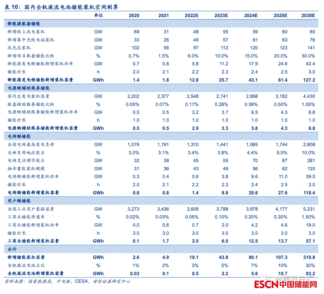 我們測算2025/2030年國內(nèi)儲能新增裝機規(guī)模有望達(dá)到107/311GWh,全釩液流電池潛在裝機空間或超10/90GWh。從結(jié)構(gòu)上來看,我們預(yù)計十四五期間新能源配套儲能將率先放量,電網(wǎng)側(cè)、用戶側(cè)儲能則將隨后大規(guī)模啟動,具體假設(shè)與測算如下。