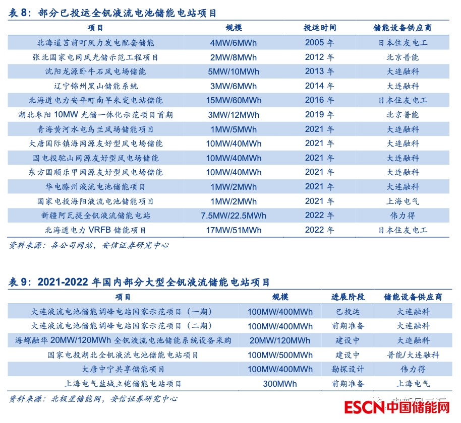 大型項目陸續(xù)啟動,全釩液流電池產(chǎn)業(yè)化進(jìn)程提速。隨著全球儲能市場的爆發(fā)以及全釩液流電池技術(shù)的成熟,我們認(rèn)為全釩液流電池規(guī)?;l(fā)展的節(jié)點已經(jīng)到來。此前全釩液流電池儲能仍處于小規(guī)模示范驗證階段,項目單體規(guī)?;静怀^10MW,而2021年以來國內(nèi)已有數(shù)個百MWh級別的大型全釩液流電池項目陸續(xù)啟動。2022年5月由大連融科建設(shè)的首個國家級大型化學(xué)儲能示范項目大連恒流儲能電站一期100MW/400MWh成功并網(wǎng),8月開始正式投入商業(yè)運營,我們認(rèn)為后續(xù)全釩液流電池儲能的產(chǎn)業(yè)化進(jìn)程將持續(xù)加快。