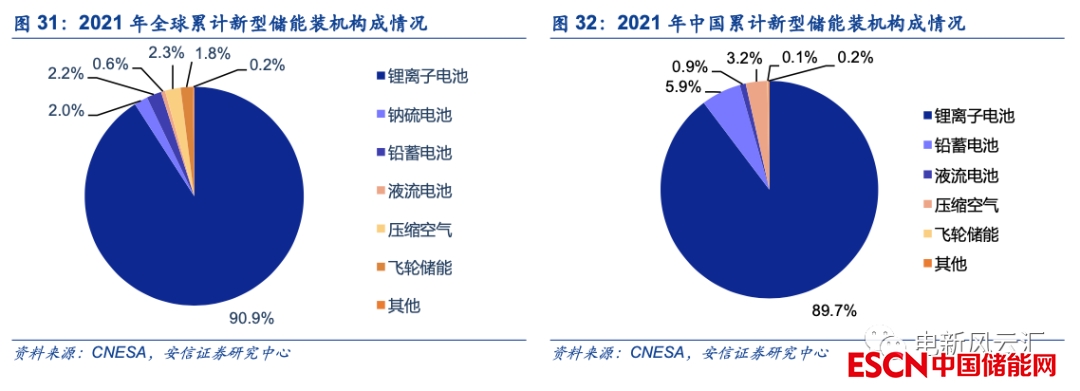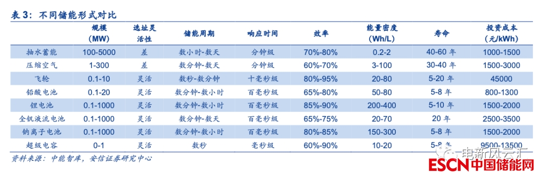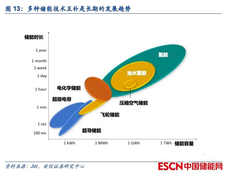 隨著儲能場景日漸多元化,多種儲能技術(shù)并存將成為長期發(fā)展趨勢。目前全球范圍內(nèi)傳統(tǒng)火電裝機仍占據(jù)主體地位,風(fēng)電、光伏的發(fā)電占比僅為10%左右,因此儲能在電力系統(tǒng)中主要起到輔助的作用,用于解決短時間、小范圍的供需不平衡。但長期來看,隨著新能源逐步成為電力系統(tǒng)的主體,儲能的應(yīng)用場景也將持續(xù)拓寬,功率范圍將涵蓋kW級的用戶側(cè)場景到GW級的發(fā)電側(cè)、電網(wǎng)側(cè)場景,儲能時長則從秒級、分鐘級、小時級到跨日、跨季不等??紤]到不同場景的儲能需求存在較大差異,我們認(rèn)為未來不太可能出現(xiàn)一種儲能技術(shù)“一統(tǒng)天下”的局面,而是多種儲能技術(shù)并存,共同支撐電力系統(tǒng)的安全與穩(wěn)定。
