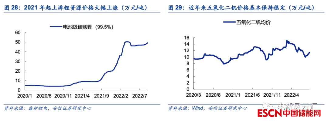 上游資源價格飆升制約鋰電降本,全釩液流電池與鋰電池儲能的經(jīng)濟性差距收窄。2021年以來,在新能車、儲能等下游市場旺盛需求的推動下,上游鋰資源的供需持續(xù)趨緊,碳酸鋰價格由2021年初的5萬元/噸左右一度飆升至50萬元/噸,鋰電產(chǎn)業(yè)鏈普遍面臨較大的原材料成本壓力,鋰電池儲能成本亦隨之明顯上行。考慮到未來新能車等儲能之外的市場對鋰資源的需求仍將保持快速增長,中短期內(nèi)鋰價或?qū)⒊掷m(xù)保持高位。相較而言,我國釩資源儲量相對豐富,且下游市場主要為鋼鐵行業(yè),需求較為穩(wěn)定,未來釩價大幅上行的可能性較小,全釩液流電池可憑借自身的技術(shù)進(jìn)步持續(xù)降本增效。因此,我們認(rèn)為當(dāng)前鋰電池和全釩液流電池的成本正呈“此消彼長”之勢,兩者之間的經(jīng)濟性差距正迅速縮小。