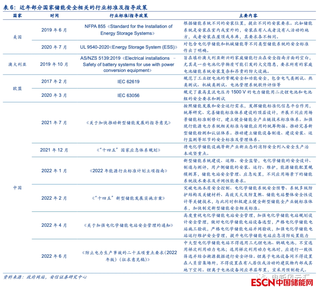 儲能行業(yè)安全標(biāo)準(zhǔn)趨嚴(yán),全釩液流電池優(yōu)勢凸顯。隨著儲能安全問題日益顯現(xiàn),近年來海內(nèi)外正加緊出臺針對儲能行業(yè)的安全規(guī)范與行業(yè)標(biāo)準(zhǔn),例如美國于2016年率先發(fā)布全球第一項儲能系統(tǒng)安全標(biāo)準(zhǔn)UL9540,對電化學(xué)儲能、機械儲能等不同類型儲能系統(tǒng)的安全標(biāo)準(zhǔn)作出了明確規(guī)定。我國儲能行業(yè)起步較晚,長期以來政策標(biāo)準(zhǔn)與行業(yè)規(guī)范相對缺失,但隨著近年來儲能行業(yè)發(fā)展不斷提速,儲能安全問題愈發(fā)得到重視,相關(guān)政策文件陸續(xù)出臺,行業(yè)標(biāo)準(zhǔn)逐步完善。國家能源局2022年6月印發(fā)的《防止電力生產(chǎn)事故的二十五項重點要求(2022年版)(征求意見稿)》中明確提出“中大型電化學(xué)儲能電站不得選用三元鋰電池、鈉硫電池,不宜選用梯次利用動力電池”,且“鋰離子電池設(shè)備間不得設(shè)置在人員密集場所,不得設(shè)置在有人居住或活動的建筑物內(nèi)部或其地下空間”,對鋰電池儲能的適用范圍進(jìn)行了嚴(yán)格限制。我們認(rèn)為隨著儲能行業(yè)安全標(biāo)準(zhǔn)的提升,安全性更佳的全釩液流電池將得到更多關(guān)注,后續(xù)應(yīng)用場景有望逐步拓寬。