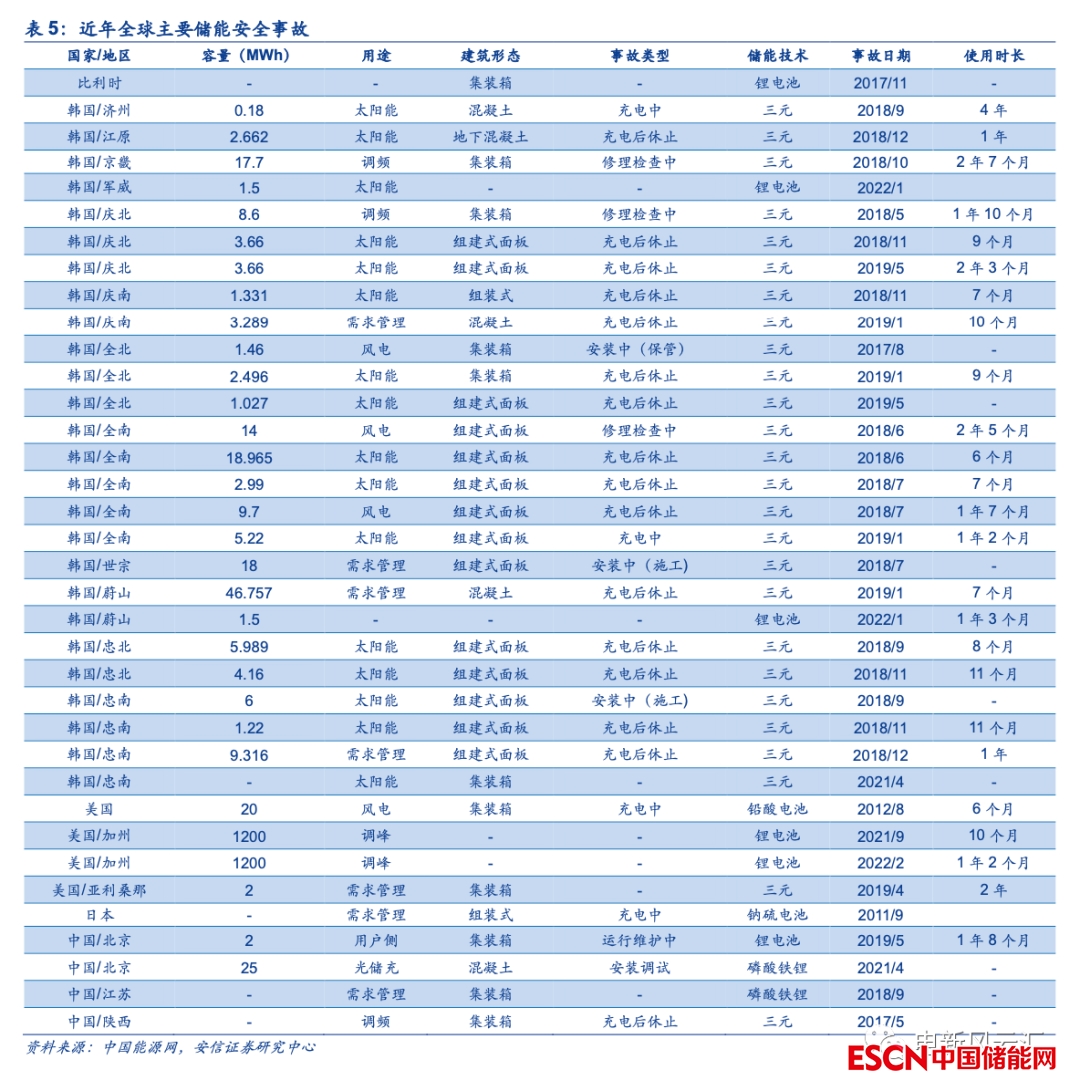 國內(nèi)外鋰電池儲能事故頻發(fā),安全問題不容忽視。根據(jù)中國能源網(wǎng)的統(tǒng)計,2010-2020年間全球范圍內(nèi)發(fā)生了32起儲能電站安全事故,而根據(jù)CNESA的統(tǒng)計,僅2021年全球就發(fā)生了至少9起儲能安全事故,2022年初韓國又發(fā)生3起電池相關(guān)火災(zāi)事故。頻繁發(fā)生的儲能安全事故不但造成了嚴(yán)重的經(jīng)濟損失,嚴(yán)重時還對人員安全構(gòu)成了較大威脅,在全球儲能市場迎來加速發(fā)展的關(guān)鍵節(jié)點,安全問題已經(jīng)成為行業(yè)亟待解決的重要問題之一,我們認(rèn)為未來安全性將成為鋰電池儲能面臨的一個巨大挑戰(zhàn)。