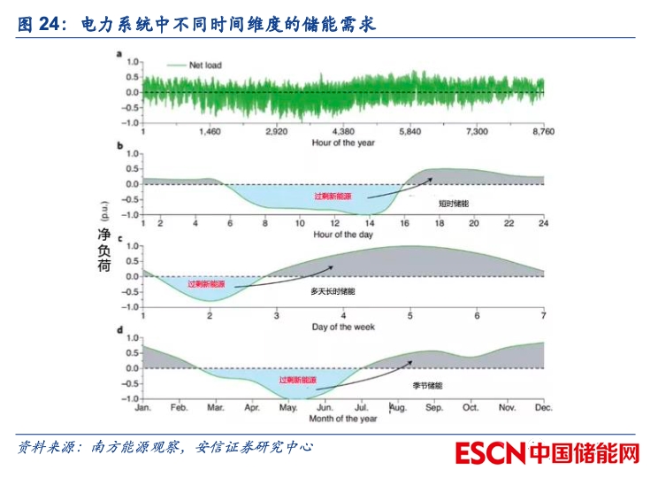 未來長時儲能將成為一類重要的儲能場景。如前所述,隨著新能源逐步成為電力系統(tǒng)的主體,其波動性與間歇性對電網(wǎng)的沖擊將愈發(fā)明顯,現(xiàn)階段儲能系統(tǒng)基本只需要對日內(nèi)、分鐘級/小時級的波動進(jìn)行平滑,而未來的儲能系統(tǒng)則需要考慮日間甚至季節(jié)間的新能源出力波動。根據(jù)美國桑迪亞國家實驗室的定義,長時儲能是持續(xù)放電時間不低于4小時的儲能技術(shù),主要針對多小時、跨日乃至跨季的電能轉(zhuǎn)移需求。我們認(rèn)為長時儲能將成為未來電力系統(tǒng)中不可或缺的一部分,根據(jù)長時儲能委員會(LDES)與麥肯錫2021年底聯(lián)合發(fā)布的報告,預(yù)計2030年全球長時儲能的裝機規(guī)模將達(dá)到4-8TWh,2040年則將達(dá)到85-140TWh。
