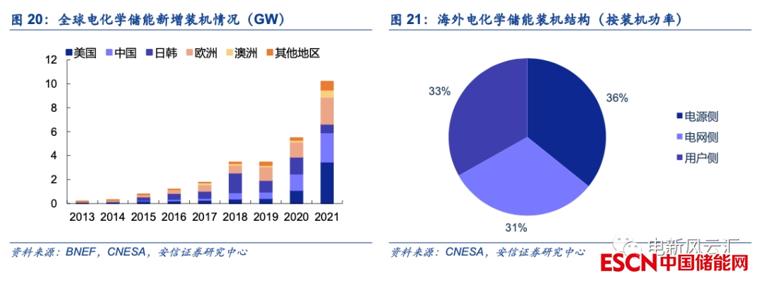 市場化驅(qū)動快速發(fā)展,供電側(cè)與用戶側(cè)齊頭并進(jìn)。目前除中國以外,海外儲能市場主要分布在美國、歐洲、日韓、澳洲等發(fā)達(dá)地區(qū),相對而言這些地區(qū)電力市場化程度較高,隨著近年來儲能成本的持續(xù)下降,行業(yè)已逐步進(jìn)入經(jīng)濟性驅(qū)動的自發(fā)增長階段。從裝機結(jié)構(gòu)來看,海外市場供電側(cè)與用戶側(cè)儲能的發(fā)展較為均衡,2021年新增裝機中電源側(cè)、電網(wǎng)側(cè)、用戶側(cè)的占比大致相當(dāng)。