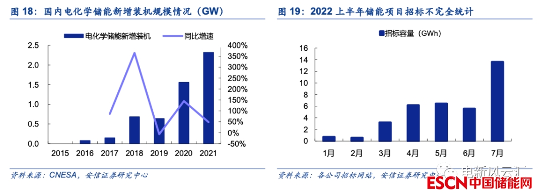 2022年國內(nèi)儲能行業(yè)正式步入發(fā)展快車道。2021年國家、地方層面均有儲能政策密集出臺,但主要側(cè)重在整體部署層面,相關(guān)的配套細(xì)則尚不完善,因此2021年為國內(nèi)儲能行業(yè)由商業(yè)化起步邁向規(guī)?;l(fā)展的過渡之年,實際落地的項目規(guī)模相對有限。根據(jù)CNESA的統(tǒng)計,2021年國內(nèi)新增新型儲能裝機2.4GW/4.9GWh,較2020年同比增長約54%,其中電化學(xué)儲能裝機2.32GW,同比增長近49%。2022年上半年受制于疫情、原材料漲價等多方面因素的影響,國內(nèi)儲能項目建設(shè)節(jié)奏整體偏慢,但二季度起國內(nèi)儲能項目招標(biāo)已集中啟動,根據(jù)我們的不完全統(tǒng)計,在排除無法取得具體招標(biāo)規(guī)模的項目后,今年上半年國內(nèi)儲能(不包括抽水蓄能)總計招標(biāo)容量已經(jīng)達(dá)到8GW/22GWh以上(主要統(tǒng)計EPC、儲能集成系統(tǒng)以及相關(guān)設(shè)備),其中二季度合計招標(biāo)量超18GWh,招標(biāo)規(guī)模較一季度明顯提升。經(jīng)過上半年的觀望與前期準(zhǔn)備,我們預(yù)計下半年起國內(nèi)儲能項目建設(shè)速度將明顯加快,僅7月我們統(tǒng)計到的國內(nèi)儲能項目招標(biāo)規(guī)模就已超過13GWh(包括南網(wǎng)科技、華電等框架性協(xié)議)。