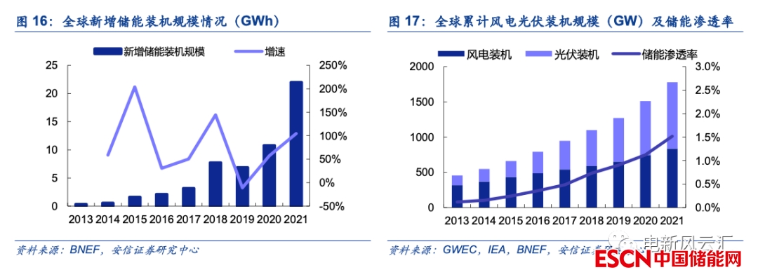 2021年起全球儲能行業(yè)進(jìn)入高速發(fā)展階段。根據(jù)BNEF統(tǒng)計,2021年全球新增儲能裝機規(guī)模為10GW/22GWh,較2020年實現(xiàn)翻倍以上增長,截至2021年底全球累計儲能裝機容量約為27GW/56GWh??紤]到2021年底全球累計風(fēng)電/光伏裝機規(guī)模已達(dá)到837/942GW,以此推算儲能在全球風(fēng)電光伏裝機中的占比僅為1.5%,我們認(rèn)為儲能市場的高速增長才剛剛開始,行業(yè)發(fā)展前景廣闊。