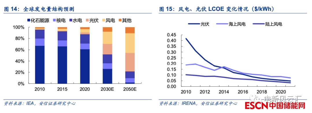 全球能源轉(zhuǎn)型加速,儲能行業(yè)規(guī)模化發(fā)展的條件已經(jīng)成熟。一方面,根據(jù)IEA的測算,為實現(xiàn)2050年碳中和的目標(biāo),可再生能源發(fā)電占比需由2020年的30%以下提升至2030年的60%以上,2050年則需達(dá)到近90%,而隨著光伏、風(fēng)電等波動性能源加速取代傳統(tǒng)的火電裝機,電力系統(tǒng)面臨的挑戰(zhàn)正日益凸顯。另一方面,隨著技術(shù)的進(jìn)步與產(chǎn)能的擴張,近年來風(fēng)電、光伏的發(fā)電成本降幅顯著,在上網(wǎng)側(cè)平價的基礎(chǔ)上,當(dāng)前全球正朝著“新能源+儲能”平價的方向快速前進(jìn)。與此同時,經(jīng)過前期的探索與實踐,儲能在電力系統(tǒng)中的定位與商業(yè)模式正日漸清晰,目前美國、歐洲等發(fā)達(dá)地區(qū)儲能市場化發(fā)展的機制已基本建立,新興市場的電力系統(tǒng)改革亦持續(xù)加速,儲能行業(yè)規(guī)?;l(fā)展的條件已經(jīng)成熟。