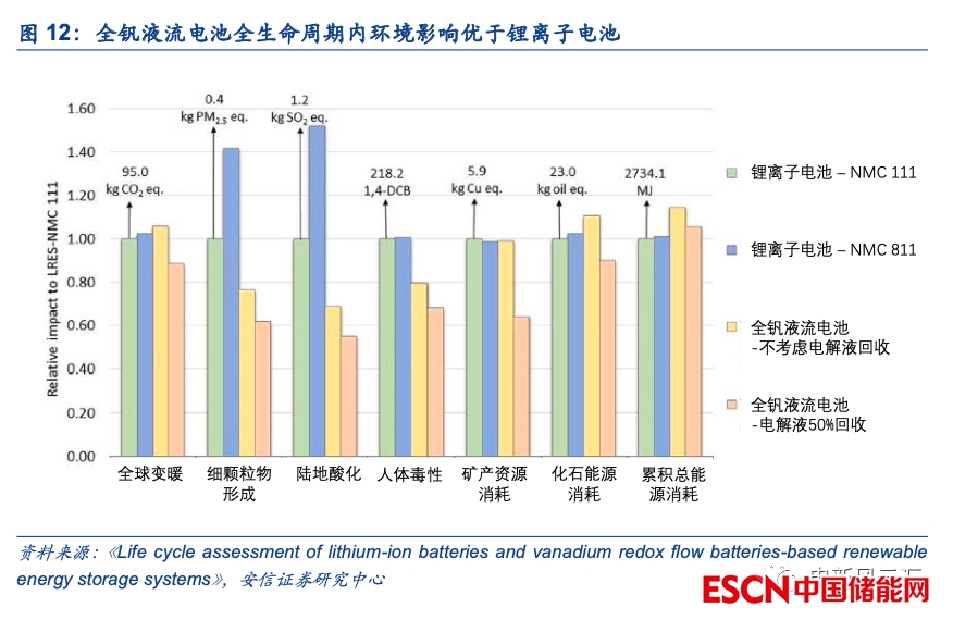全釩液流電池在運行過程中不涉及污染與排放,且電解液可循環(huán)利用,是一種綠色環(huán)保的儲能形式。全釩液流電池中釩元素以離子形式存在于酸性水系溶液中,而不是以釩的氧化物形式存在(如五氧化二釩),有一定的腐蝕性但無毒性,且工作過程中封閉運行,對環(huán)境與人體基本不會產(chǎn)生危害。此外,從全生命周期的角度來看,鋰電池儲能系統(tǒng)在壽命到期后各類材料的回收處理難度較大,而全釩液流電池的釩電解液可在電池領(lǐng)域長期循環(huán)使用或進(jìn)行釩提取進(jìn)入鋼鐵、合金等其他市場領(lǐng)域,電堆關(guān)鍵部件(如碳電極、雙極板、離子交換膜等)以及管路、閥泵等的處理也更為簡單,無環(huán)境負(fù)擔(dān),所以無論是從回收成本角度還是污染排放角度均優(yōu)于鋰電池。根據(jù)根特大學(xué)的研究,在釩電解液50%回收的條件下,全釩液流電池在陸地酸化、人體毒性、細(xì)顆粒物形成、礦產(chǎn)資源消耗、化石能源消耗等方面的環(huán)境影響幾乎全面低于鋰離子電池。