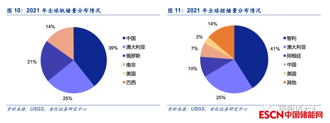 中國為釩生產(chǎn)與消費大國,釩資源自主可控。根據(jù)USGS的估算,2021年底中國釩儲量規(guī)模約為950萬噸(本段均以釩金屬當(dāng)量計),在全球儲量中的占比約為40%,而從產(chǎn)量來看,2021年中國釩產(chǎn)量達(dá)到7.3萬噸,在全球產(chǎn)量中的占比接近2/3,因此無論是從儲量還是產(chǎn)能的角度出發(fā),我國對釩資源均有較強的掌控能力。相較而言,2021年國內(nèi)鋰資源的全球儲量占比僅為7%,產(chǎn)量占比不到15%,鋰電產(chǎn)業(yè)鏈對海外礦產(chǎn)資源的依賴較強。