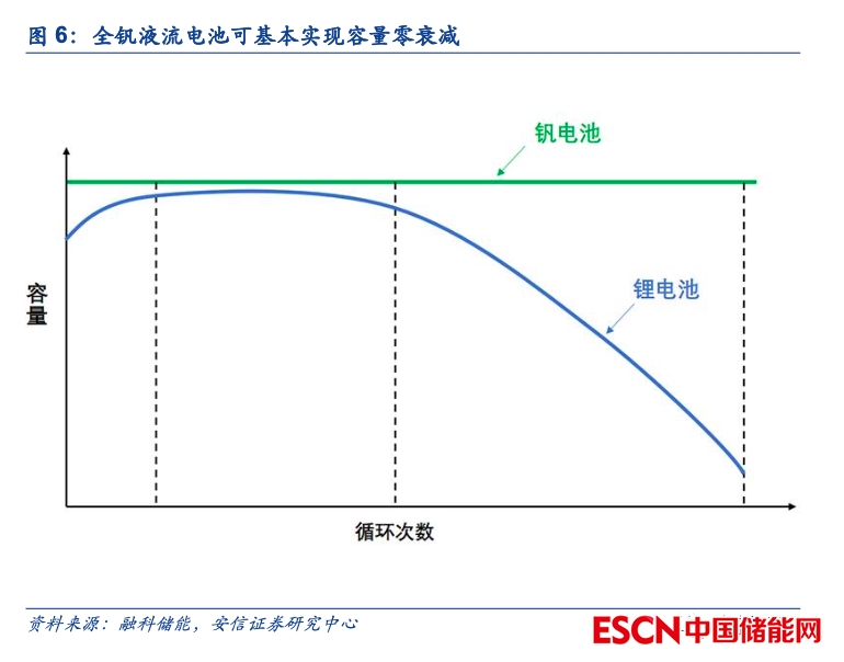 全釩液流電池循環(huán)次數(shù)明顯優(yōu)于鋰離子電池,且生命周期內(nèi)容量可完全恢復(fù),生命周期內(nèi)度電容量可利用率高。一方面,全釩液流電池使用不同價態(tài)的釩離子作為電池的活性物質(zhì),反應(yīng)過程僅為釩離子的價態(tài)變化,不涉及液固相變,且克服了電解質(zhì)交叉污染的問題;另一方面,全釩液流電池的在充放電過程中電極材料不參與電化學(xué)反應(yīng),屬于惰性電極,電極和雙極板等材料穩(wěn)定性好,不涉及更換;此外,針對全釩液流電池因電解液在正負(fù)極之間的遷移和副反應(yīng)造成的釩離子價態(tài)失衡帶來的容量衰減問題,一般可以通過低成本的物理和化學(xué)手段進(jìn)行恢復(fù)。因此,全釩液流電池理論上具備極長的循環(huán)壽命,而從早期項目的實證情況來看,全釩液流電池長壽命的優(yōu)點亦得到了充分驗證。例如住友電工2005-2007年實施的4MW/6MWh全釩液流電池系統(tǒng)配合風(fēng)場在三年間進(jìn)行了20多萬次的充放電,大連融科與國電龍源合作投運的5MW/10MWh全釩液流電池系統(tǒng)從2012年12月并網(wǎng)至今已有9年多的日歷使用時間,效率和容量均未見衰減。相較而言,目前磷酸鐵鋰電池的循環(huán)次數(shù)僅為5000-10000次,若考慮到儲能系統(tǒng)中電芯一致性的問題,則系統(tǒng)層面的循環(huán)壽命往往更低,同時鋰離子電池的可用容量亦會隨著循環(huán)次數(shù)的增加而明顯下降。因此,我們認(rèn)為從全生命周期的角度來看,全釩液流電池具備一定的優(yōu)勢。