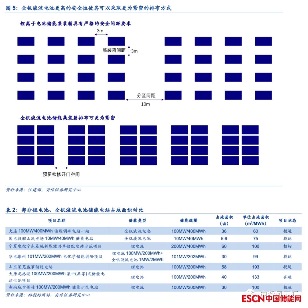 全釩液流電池更高的安全性使其可以采取更為緊密的排布方式,從而在項目層面減少土地的占用。相較于鋰離子電池,全釩液流電池在單體能量密度上存在較大差距,例如大連融科20尺儲能集裝箱產(chǎn)品TPower的儲能容量為0.5MWh,而當(dāng)前主流鋰電池儲能集成商的20尺集裝箱系統(tǒng)儲存容量一般超過3MWh。但是對于大型儲能項目,鋰離子電池儲能系統(tǒng)需要滿足更為嚴(yán)格的消防及安全標(biāo)準(zhǔn),因此在集裝箱的排布上必須留出更大的安全距離。住建部2022年6月發(fā)布的《電化學(xué)儲能電站設(shè)計標(biāo)準(zhǔn)(征求意見稿)》中明確指出鋰離子電池預(yù)制艙長邊及短邊間距均不宜小于3m,同時鋰離子電池設(shè)備宜分區(qū)布置,屋外電池預(yù)制艙(柜)布置分區(qū)內(nèi)儲能系統(tǒng)額定能量不宜超過50MWh,相鄰分區(qū)的間距不應(yīng)小于10m,而對于全釩液流電池,征求意見稿并未作出相應(yīng)的規(guī)定。表2列示了部分建成及在建全釩液流電池儲能電站和鋰電池儲能電站的占地面積情況,就這些項目而言全釩液流電池儲能電站的單位占地面積明顯小于鋰電池儲能電站。因此,我們認(rèn)為全釩液流電池的本征安全性可以使其采取更為緊密的排布方式,從而部分彌補其在能量密度上的劣勢,節(jié)省儲能項目的土地占用。