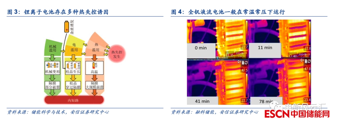 相較于鋰離子電池,全釩液流電池具有更好的安全性。對于鋰離子電池而言,一旦電池內(nèi)部出現(xiàn)短路或工作溫度過高,電解液就極易發(fā)生分解、氣化,進(jìn)而引發(fā)電池燃燒或爆炸,造成極大的安全隱患。而全釩液流電池的電解液為釩離子的酸性水溶液,在常溫常壓下運行,不存在熱失控風(fēng)險,具有本征安全性。根據(jù)實證結(jié)果,在理論100%SOC下,即便將正負(fù)極電解液直接互混,溫度由32°C升至70°C,全釩液流電池系統(tǒng)不會產(chǎn)生燃燒、起火等風(fēng)險。因此,對于人員密集、規(guī)模比較大、安全性要求較高的儲能場景,全釩液流電池是一種更為安全可靠的技術(shù)。