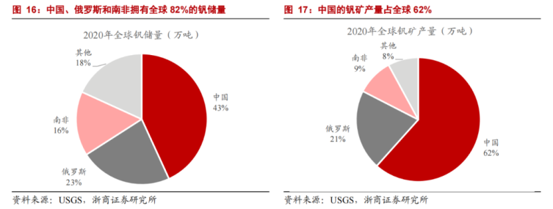 由于釩是一種小金屬,應(yīng)用場(chǎng)景并不豐富,目前全球近62%的釩由中國(guó)產(chǎn)出,俄羅斯和南非分別產(chǎn)出21%和9%。