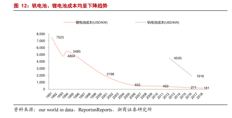 盡管目前全釩液流電池成本較高,但對(duì)比鋰電池價(jià)格的歷史走勢(shì),全釩液流電池大概率會(huì)隨著規(guī)模放量而成本驟降。
