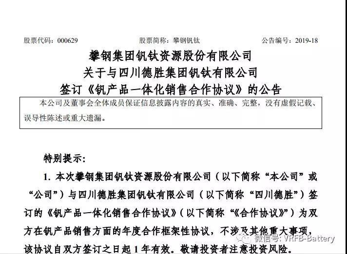 中國儲能網(wǎng)訊:攀鋼集團(tuán)釩鈦資源股份有限公司關(guān)于與四川德勝集團(tuán)釩鈦有限公司簽訂《釩產(chǎn)品一體化銷售合作協(xié)議》的公告: