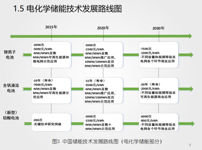 這個(gè)可能大家也比較熟悉,這是2016年的數(shù)據(jù),就是我們儲(chǔ)能裝機(jī)容量的比例圖,我們電化學(xué)儲(chǔ)能現(xiàn)在蓬勃的發(fā)展,但是在2016年的時(shí)候依然只有3%,但是它發(fā)展的很快,可以看到下面的柱狀圖,2012年的時(shí)候它的電化學(xué)裝機(jī)容量規(guī)模是在接近600兆瓦的裝機(jī)規(guī)模,到2018年到了3600兆瓦,已經(jīng)翻了六番。為什么它可以發(fā)展這么快?我想可能有三點(diǎn)原因:第一點(diǎn),它的成本下降非???,可能剛才王主任也說(shuō)到了,鋰電池的成本,2020年我看圖上面寫到成本大概是在1.1元/瓦時(shí),這樣其實(shí)在幾年以前還是非常貴,可能3元左右人民幣,所以說(shuō)成本的下降推動(dòng)了它的蓬勃發(fā)展。第二點(diǎn),電化學(xué)電池是不受到地域的限制的,比如說(shuō)抽水蓄能或者是其他的方式,可能需要有水,所以說(shuō)電化學(xué)可能會(huì)不受地域的限制。第三點(diǎn),能量轉(zhuǎn)換效率很高,鋰電池差不多在90%以上,我的液流電池現(xiàn)在比較成熟的產(chǎn)品效率是在80%左右。這個(gè)是我們中國(guó)的儲(chǔ)能發(fā)展技術(shù)路線圖,我們可以大概看一下,我們國(guó)家給它從2015、2020年、2030年制定的不同的發(fā)展方向。