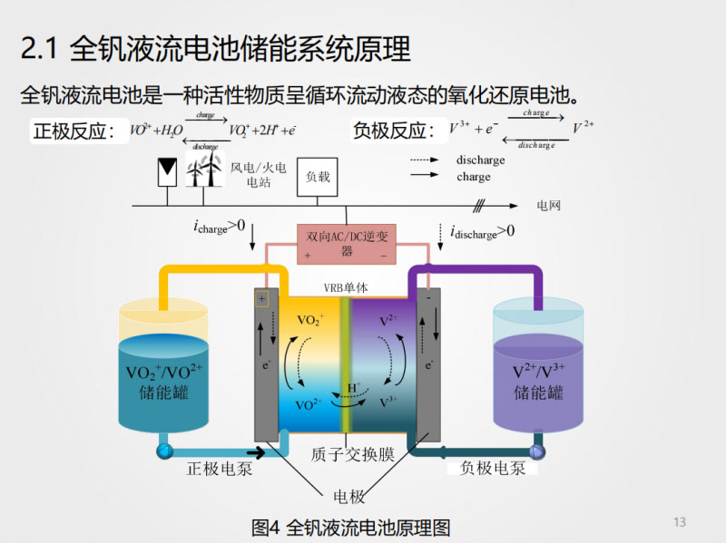 圖四就是全釩液流電池的原理圖,也是比較比較抽象的原理圖,肯定不是實(shí)際的。有四部分組成,首先我們要有電解液,第二個(gè)就是我要有電堆,電堆是它發(fā)生化學(xué)反應(yīng)的地方,這是它的一個(gè)核心。第三個(gè),它有兩個(gè)儲(chǔ)能罐,還要有兩個(gè)電泵,這兩個(gè)電泵就是儲(chǔ)能罐里的電解液,它的正極是釩的四價(jià)跟五價(jià)組成的,負(fù)極是釩的二價(jià)和三價(jià)組成的,可能大家覺(jué)得這個(gè)圖為什么是花花綠的,實(shí)際上不同的釩的二、三、四、五價(jià)是不一樣的,所以畫成這樣子了。