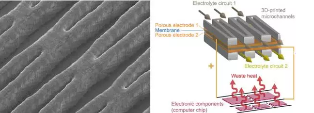 使用3D打印,該團(tuán)隊(duì)開發(fā)了一種楔形微通道系統(tǒng),可以使用很少的泵浦功率為系統(tǒng)提供電解質(zhì)。所得電極將液體壓入離子可流動(dòng)的膜層中,產(chǎn)生電力。結(jié)果是產(chǎn)生1.4瓦每平方厘米的系統(tǒng),在考慮泵送后,剩下1瓦留給電池供電。此外,它擺脫了比它更多的熱量,同時(shí)脫離了電源和冷卻芯片的整潔的技巧。