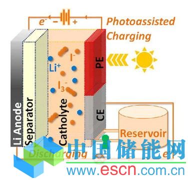 水性電解質(zhì)與電池的反電極和太陽能電池的染料敏化光電極接觸。給電池充電時(shí),要將其暴露于陽光下,陽光會使電解液中的染料分子為光電極提供電子,降低電池充電所需能量。