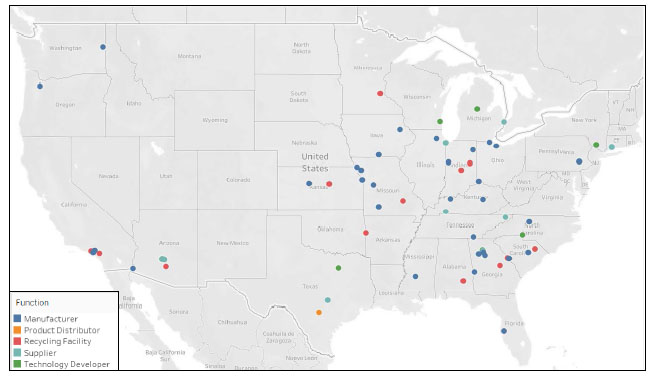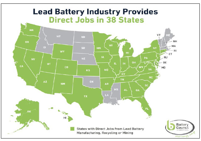 在美國(guó),鉛酸電池行業(yè)的年產(chǎn)值為263億美元。它們?cè)诿绹?guó)國(guó)內(nèi)生產(chǎn),并且99%被回收。鉛酸電池在美國(guó)18個(gè)州生產(chǎn)。此外,美國(guó)有10個(gè)州有電池回收設(shè)施,有9個(gè)州擁有技術(shù)開發(fā)設(shè)施,還有10個(gè)州的公司為鉛酸工業(yè)提供原材料(例如石墨)或設(shè)備。鉛酸電池行業(yè)已經(jīng)在美國(guó)38個(gè)州創(chuàng)造了近25,000個(gè)工作崗位(制造?;厥?、運(yùn)輸、分配和采礦)。圖27和28分別顯示了美國(guó)電池制造設(shè)施分布和創(chuàng)造的就業(yè)機(jī)會(huì)。