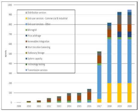 與交通運(yùn)輸行業(yè)的增長(zhǎng)相比,固定儲(chǔ)能增長(zhǎng)比較平緩。這通常是因?yàn)榭稍偕茉赐ǔJ浅杀咀畹偷陌l(fā)電來源,但是需要存儲(chǔ)其電力以減緩可變性。而美國(guó)是全球固定儲(chǔ)能部署的領(lǐng)導(dǎo)者。例如,在太陽(yáng)能發(fā)電設(shè)施替代裝機(jī)容量為9GW的天然氣發(fā)電設(shè)施之后,加州電網(wǎng)估計(jì)需要部署裝機(jī)容量為12GW的儲(chǔ)能系統(tǒng)進(jìn)行平衡。到目前為止,加州公用事業(yè)委員會(huì)已批準(zhǔn)了裝機(jī)容量總計(jì)為5.1GW的電池儲(chǔ)能系統(tǒng),計(jì)劃到2022年完成部署。