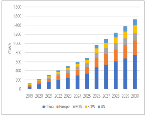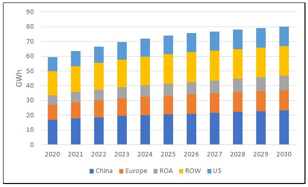 圖11. Avicenne公司對(duì)鋰離子電池在全球各地市場(chǎng)的部署預(yù)測(cè)