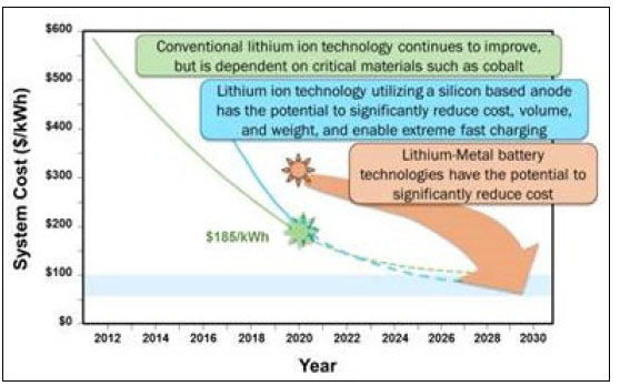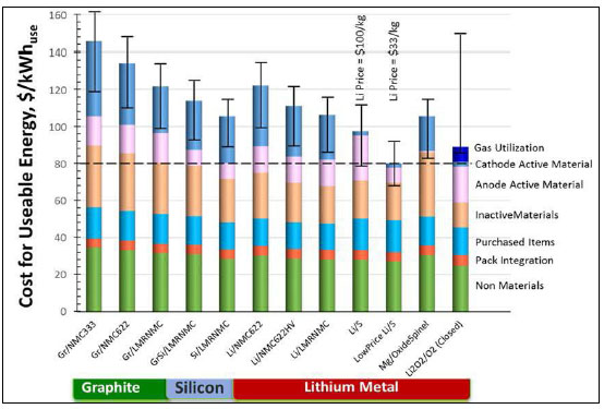圖18提供了xEV鋰離子電池的成本和技術(shù)發(fā)展趨勢(shì)。圖19概述了候選電池技術(shù)及其滿足美國(guó)能源部(DOE)成本目標(biāo)的可能能力。由于不同電池技術(shù)的差異很大,電池研究還包括多個(gè)活動(dòng)的重點(diǎn)是解決整個(gè)電池供應(yīng)鏈中的高成本領(lǐng)域。